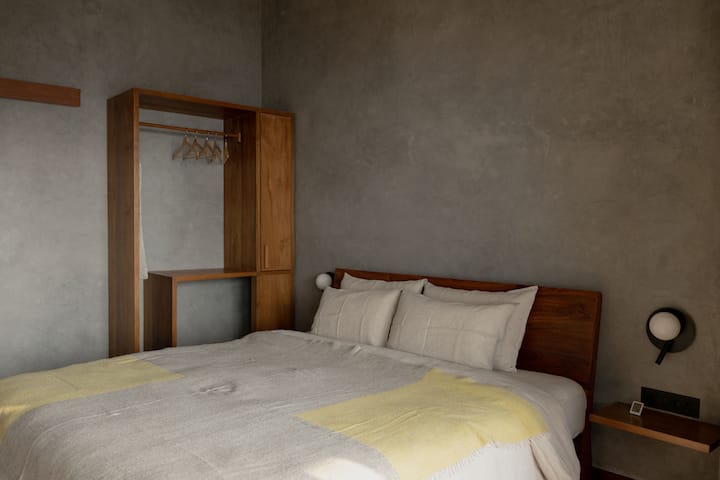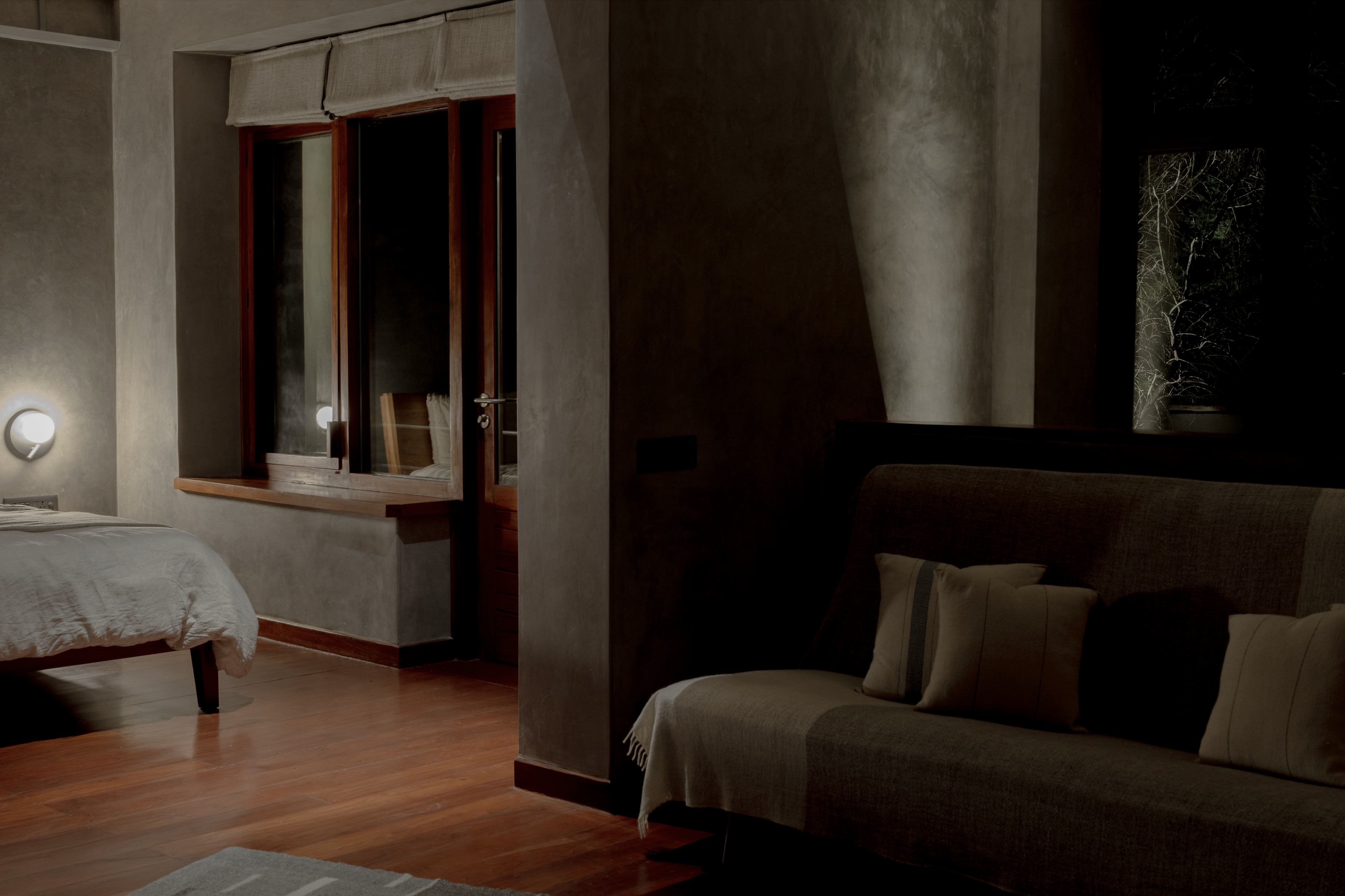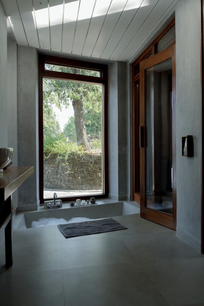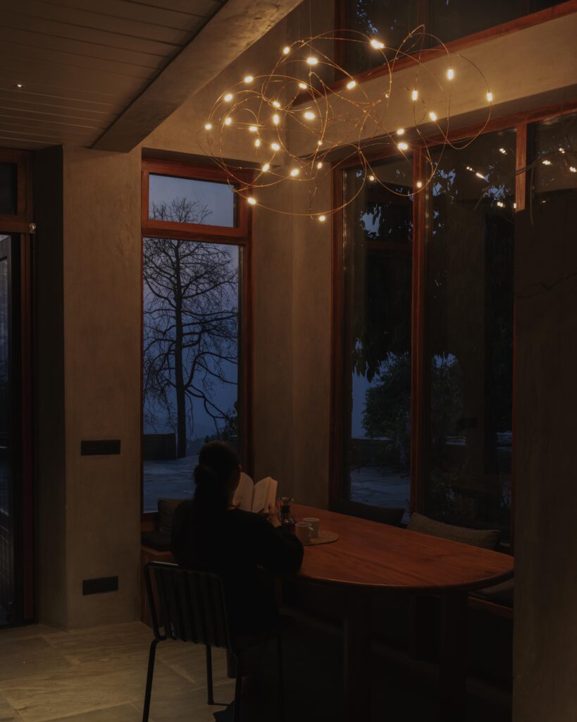The house sits within an acre of farm forest, surrounded by the mighty Himalayan mountains and nearby villages. Large windows frame the Himalayan landscape, drawing the seasons and the sky into every room. The interiors are quiet and grounding, made from Himalayan red cedar, golden slate, lime walls, linen and wool. Nature is not an accent but a constant presence. Heated floors and a solar-powered sauna keep the house comfortable through snow, rain and sun. A fire in the hearth and the scent of pine make long evenings feel warm and familiar.